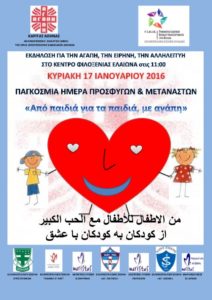 Μεγάλη επιτυχία, πέρα από κάθε προσδοκία, σημείωσε η εκδήλωση «Από παιδιά για τα παιδιά, με αγάπη» που διοργάνωσε η Κάριτας Αθήνας σε συνεργασία με τη Γραμματεία Ιδιωτικών Εκπαιδευτικών Ιδρυμάτων Ελλάδας (ΓΙΕΙΕ) και έξι Ελληνογαλλικά σχολεία της Αθήνας και του Πειραιά στο Κέντρο Φιλοξενίας του Ελαιώνα, με αφορμή την εφετινή καθιέρωση της Παγκόσμιας Ημέρας Προσφύγων και Μεταναστών από το Βατικανό, στις 17 Ιανουαρίου.