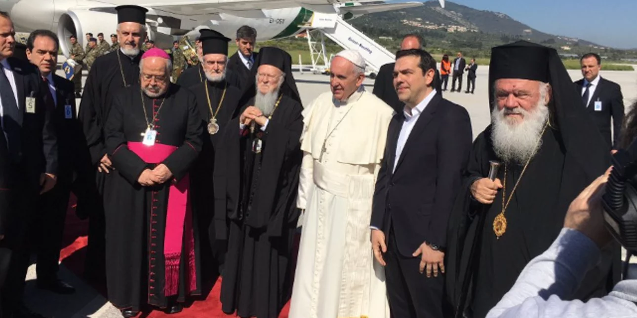 Photo from Pope Francis' visit to Lesbos to meet with refugees, April 2016. In the photo, Pope Francis with Ecumenical Patriarch Bartholomew, Archbishop Ieronymos of Athens and All Greece, and Prime Minister Alexis Tsipras.